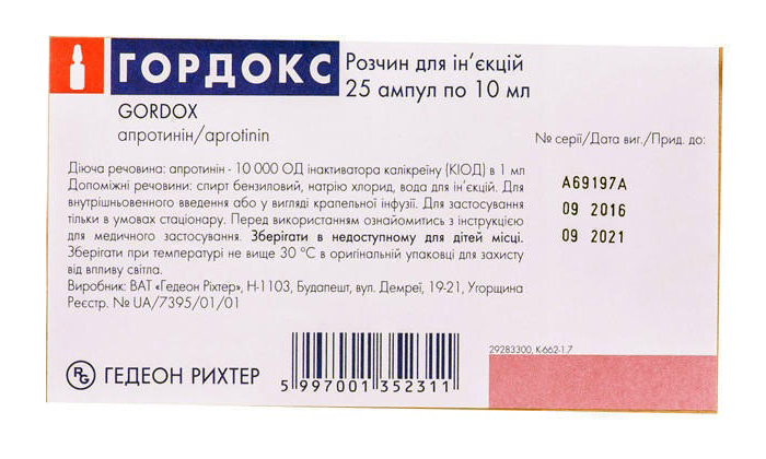 Гордокс® совместим с 20% раствором глюкозы, раствором гидроксиэтилированного крахмала, лактатным раствором Рингера.