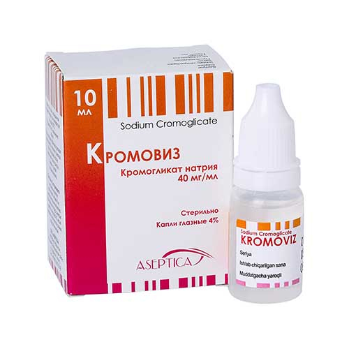 Кромовиз-противоаллергическое средство, в состав которого входит динатриевая соль кромоглициевой кислоты. Терапевтический эффект заключается в мембраностабилизирующем действии кромоглицевой кислоты, которая препятствует дегрануляции тучных клеток и выделению из них гистамина, брадикинина, лейкотриенов (в том числе, медленно реагирующей субстанции анафилаксии), простагландинов и других биологически активных веществ. Препарат Кромовиз наиболее эффективен при профилактическом применении, так как предупреждает развитие аллергических и воспалительных реакций. Полный клинический эффект при аллергических заболеваниях глаз наступает в течение нескольких дней или недель.