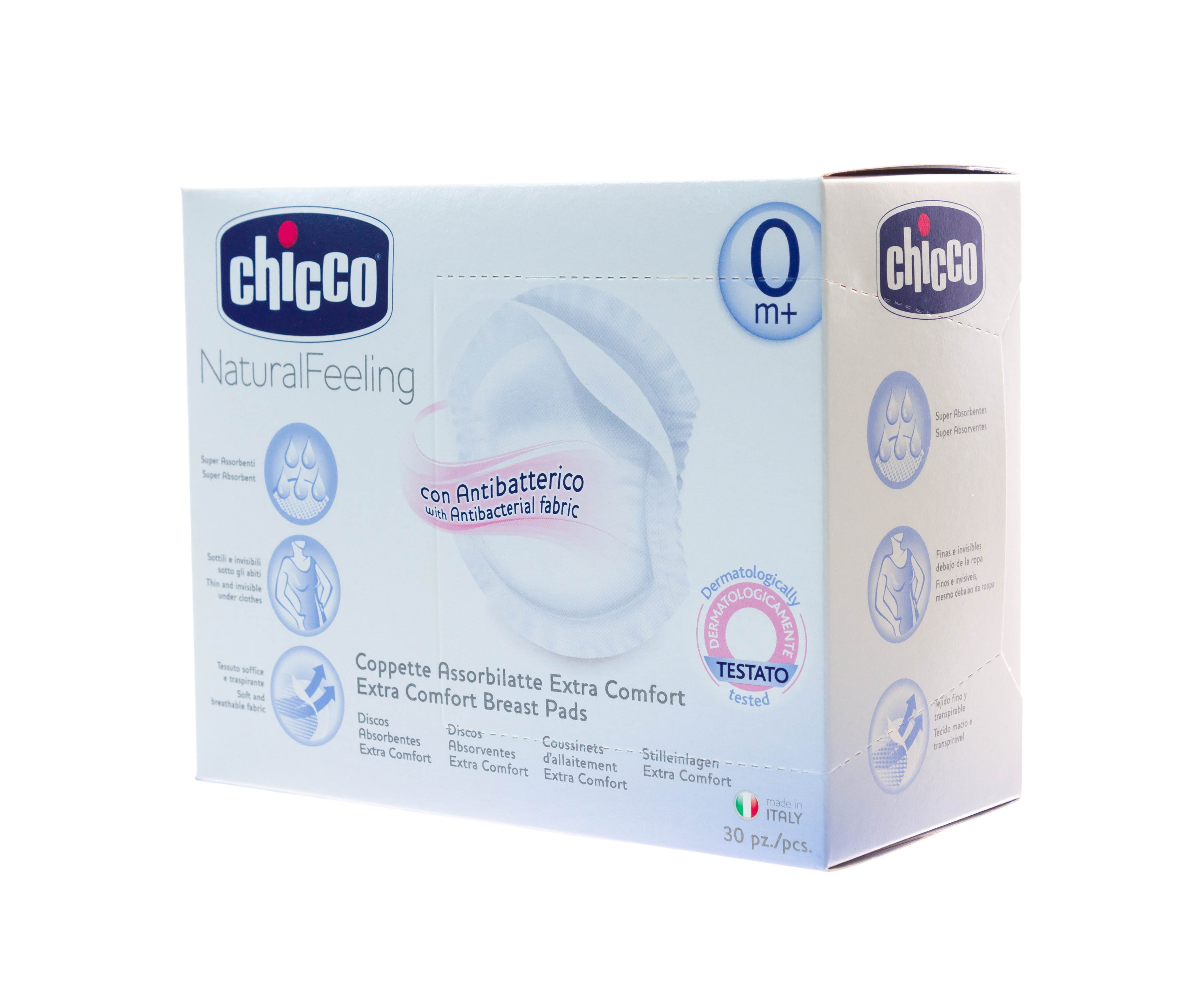 В комплекте: упаковка антибактериальных одноразовых прокладок для груди Chicco 30 шт.