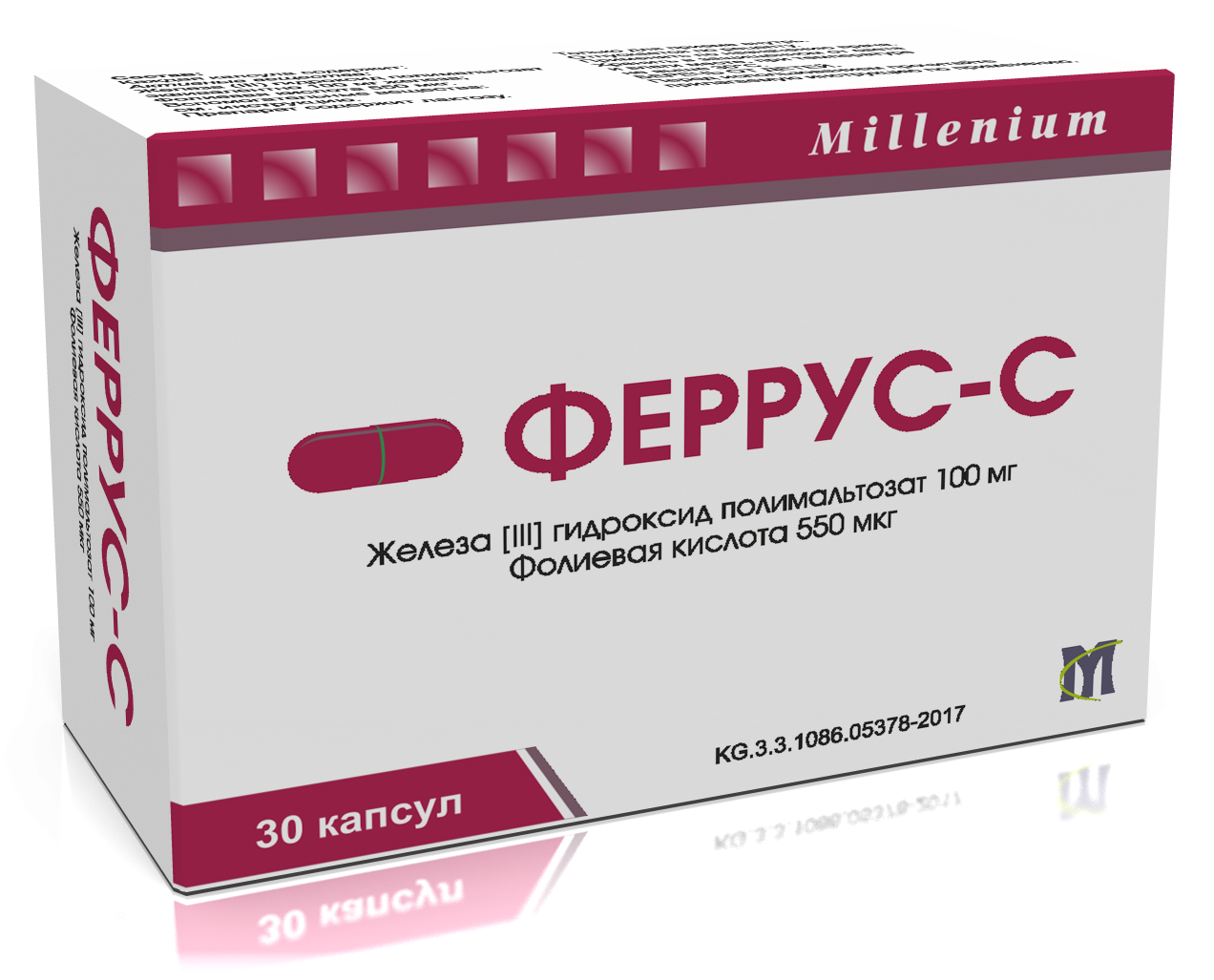 Феррус-С содержит железо в виде полимальтозного комплекса гидроокиси железа (III) и фолиевую кислоту. Данный макромолекулярный комплекс стабилен и не выделяет железо в виде свободных ионов в ЖКТ. Структура полимальтозного комплекса гидроксида железа (III) сходна с естественным соединением железа -ферритином. Благодаря такому сходству, железо (III) поступает из кишечника в кровь путем активного транспорта. Всосавшееся железо связывается с ферритином и хранится в организме, преимущественно в печени. Затем в костном мозге оно включается в состав гемоглобина. Железо, входящее в состав полимальтозного комплекса гидроокиси железа (III), не обладает прооксидантными свойствами, в отличие от простых солей железа. Существует корреляция между выраженностью дефицита железа и уровнем его всасывания (чем больше выраженность дефицита железа, тем лучше всасывание). Наиболее активный процесс всасывания происходит в двенадцатиперстной и тонкой кишке. Фолиевая кислота -витамин группы В, стимулирует эритропоэз, участвует в синтезе аминокислот, нуклеиновых кислот, пуринов, пиримидинов, в обмене холина. Препарат Феррус-С не вызывает окрашивание эмали зубов.