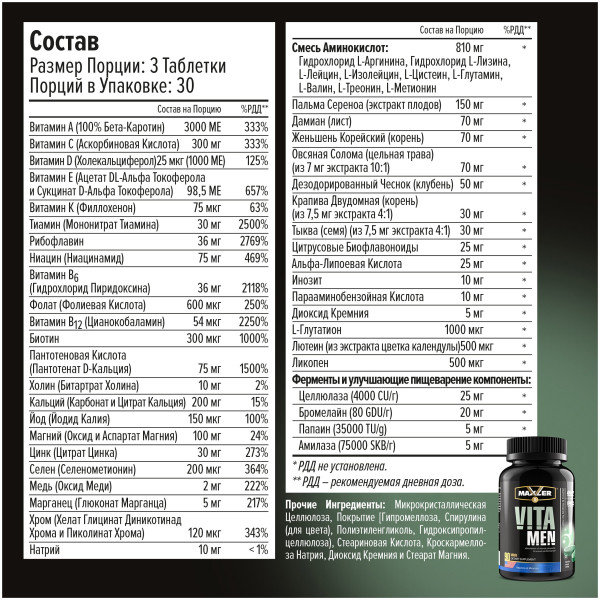 Ориентированный на мужчин, комплекс минералов и фито-компонентов Vita Men способствует усилению психической и физической активности, улучшает обменные процессы в мозгу, оздоравливает простату, нормализует работу пищеварительной системы и сводит к минимуму негативные последствия стресса. Кроме того, данный комплекс снабжает спортсмена быстро усваиваемыми аминокислотами, которые положительно влияют на работу организма и поддерживают процессы влияющие на рост мускулатуры.