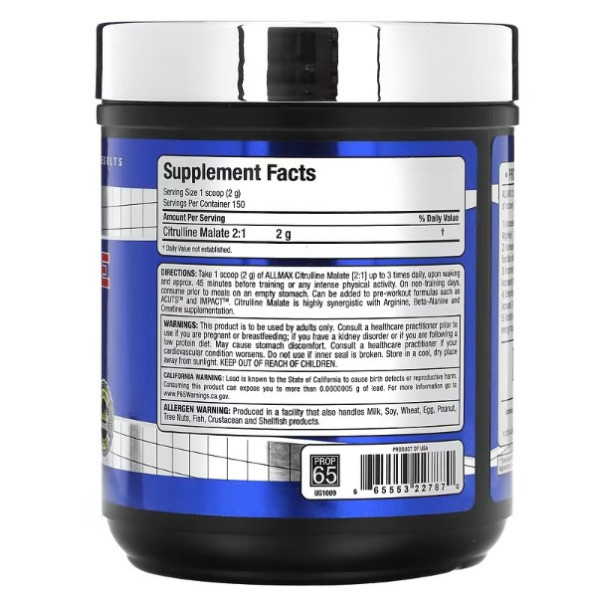 Принимайте по 1 мерной ложке (2 г) цитруллина малата ALLMAX [2:1] до 3 раз в день, после пробуждения и прибл. за 45 минут до тренировки или любой интенсивной физической нагрузки. В дни отдыха принимать перед едой натощак. Можно добавлять в средства для приема перед тренировкой, такие как ACUTS™ и IMPACT™. Цитруллин малат имеет синергетический эффект с добавками аргинина, бета-аланина и креатина.