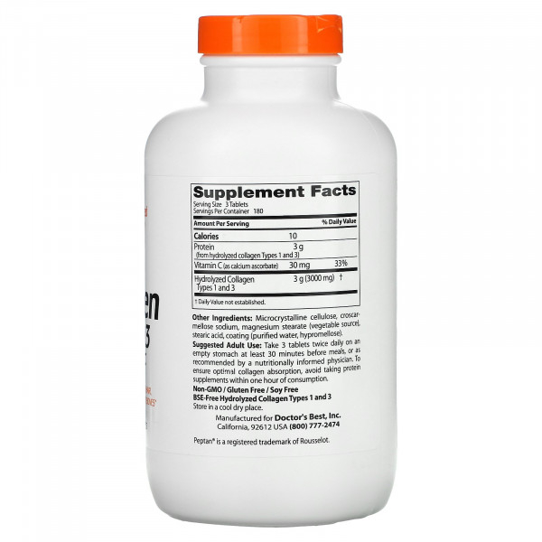 Doctor's Best, коллаген типа 1 и 3 с Peptan и витамином C, 1000 мг, 540 таблеток