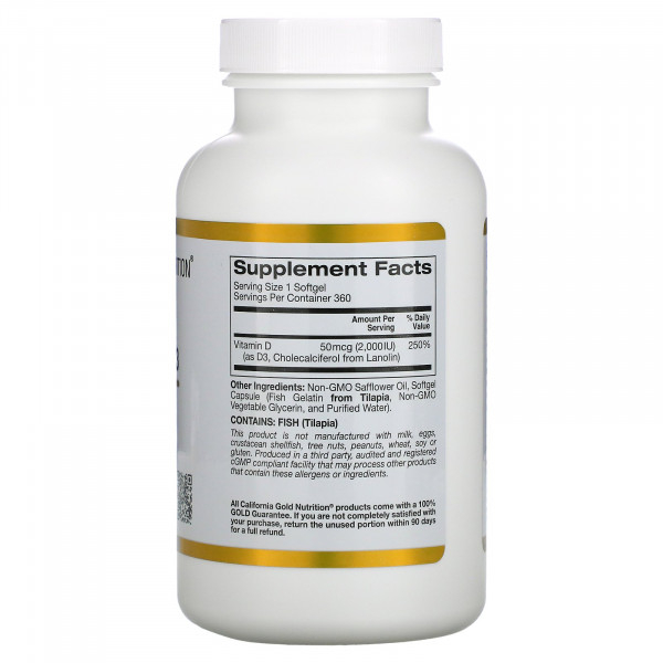 California Gold Nutrition, витамин D3, 50 мкг (2000 МЕ), 360 рыбно-желатиновых капсул