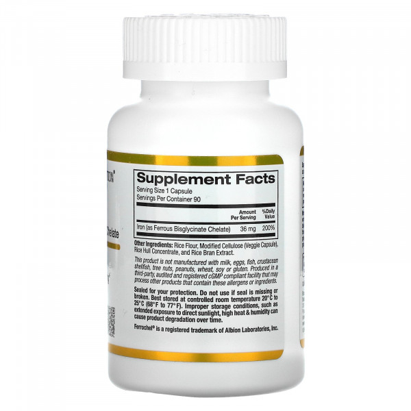 California Gold Nutrition, Ferrochel, железо (бисглицинат), 36 мг, 90 растительных капсул