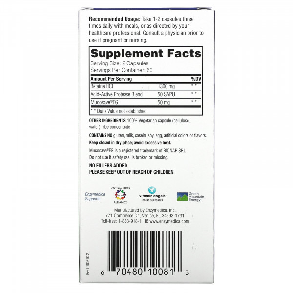 Enzymedica, бетаин гидрохлорид, 120 капсул