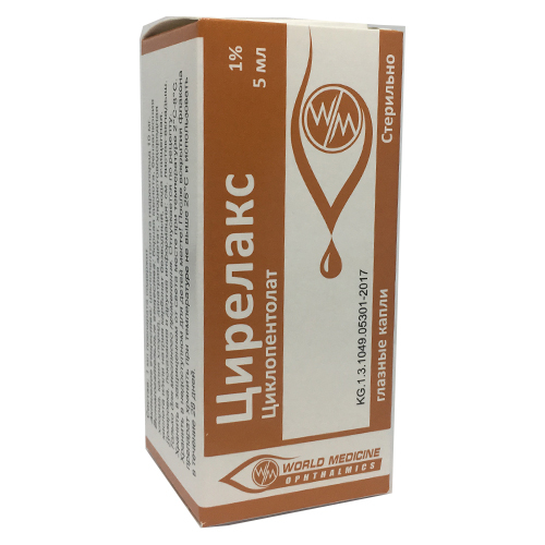 Цирелакс в качестве активного вещества содержит циклопентолата гидрохлорид, являющийся третичным синтетическим амином, схожий по действию с атропином. Блокирует м-холинорецепторы, препятствует действию медиатора холинергических синапсов – ацетилхолина.