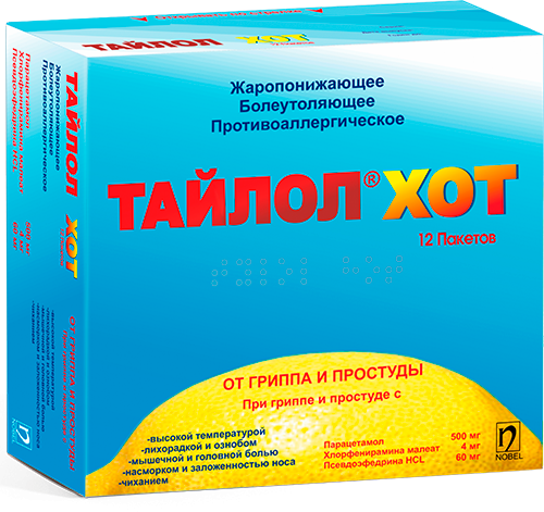 Тайлол Хот применяется при простуде, гриппе и других инфекциях верхних дыхательных путей, проявляющихся следующими симптомами: недомогание, повышение температуры и головная боль, ринорея, закупорка носового канала, чихание, общие болевые состояния.