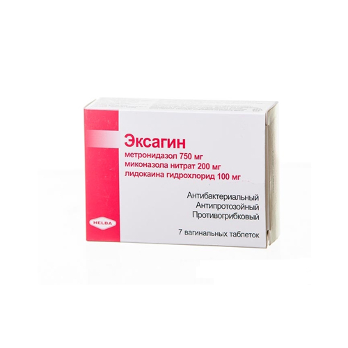 Только для интравагинального применения. В связи с риском кардиотоксического действия препарат Эксагин одновременно с антиаритмическими препаратами (пимозид, амиодарон и другими) можно назначать только после тщательного обследования (включая ЭКГ, Эхо-КГ, Холтеровское мониторирование ЭКГ) и под наблюдением врача-кардиолога, регулярно оценивающего соотношение польза-риск для пациента. При необходимости применения препарат Эксагин одновременно с антикоагулянтами непрямого действия следует регулярно оценивать риск проводимой терапии и контролировать показатели свертывающей системы крови. В связи с риском лекарственного взаимодействия у пациентов, получающих комбинированное лечение (см. раздел «Лекарственные взаимодействия»), следует также регулярно контролировать лабораторные показатели (общий анализ крови, биохимические показатели, в том числе - концентрацию глюкозы, клиренс креатинина, активность «печеночных» трансаминаз в крови), в некоторых случаях может потребоваться консультация врача-гематолога и/или гастроэнтеролога. Большие дозы и длительное систематическое применение препарата могут вызывать периферическую невропатию и судороги. Необходимо избегать приема алкоголя во время лечения и, по крайней мере, в течение 24-48 ч после окончания курса ввиду возможных дисульфирамо-подобных реакций. Частота возникновения системных побочных эффектов очень низкая, поскольку при интравагинальном применении метронидазола, содержащегося в вагинальных таблетках Эксагин, его концентрация в плазме крови очень низкая (2-12% по сравнению с пероральным введением). При вагинитах слизистая влагалища может быть воспалена, следовательно вагинальное жжение и зуд могут наблюдаться при введении первой таблетки. Эти симптомы быстро исчезают при продолжении лечения. При возникновении сильного раздражения слизистых на фоне применения препарата лечение следует прекратить и обратиться за консультацией к врачу. Не рекомендуется применение Эксагина в период менструации, т.к. уменьшается эффективность препарата или возникают трудности при его использовании. Следует проявлять осторожность при использовании вагинальных таблеток одновременно с контрацептивными диафрагмами и презервативами ввиду возможного взаимодействия резины с основой таблеток. Другие продукты для интимной гигиены (тампоны, средства для душа, спермициды) не должны использоваться во время лечения. Пациенткам с диагнозом трихомонадный вагинит необходимо рекомендовать одновременное лечение их полового партнера. При нарушении функции почек Снижение функции почек не влияет на фармакокинетику лидокаина, но может вызывать накопление метаболитов. Эти особенности необходимо учитывать при назначении Эксагин пациентам со сниженной функцией почек. При нарушении функции печени При серьезных нарушениях функции печени может быть снижен клиренс метронидазола. Большие дозы метронидазола могут вызывать симптомы энцефалопатии и поэтому должны применяться с осторожностью у пациентов с печеночной энцефалопатией. Для пациентов, страдающих печеночной энцефалопатией, ежедневная доза метронидазола должна быть снижена до 1/3. У пациентов со сниженной функцией печени период полувыведения лидокаина может увеличиться в два или более раза.