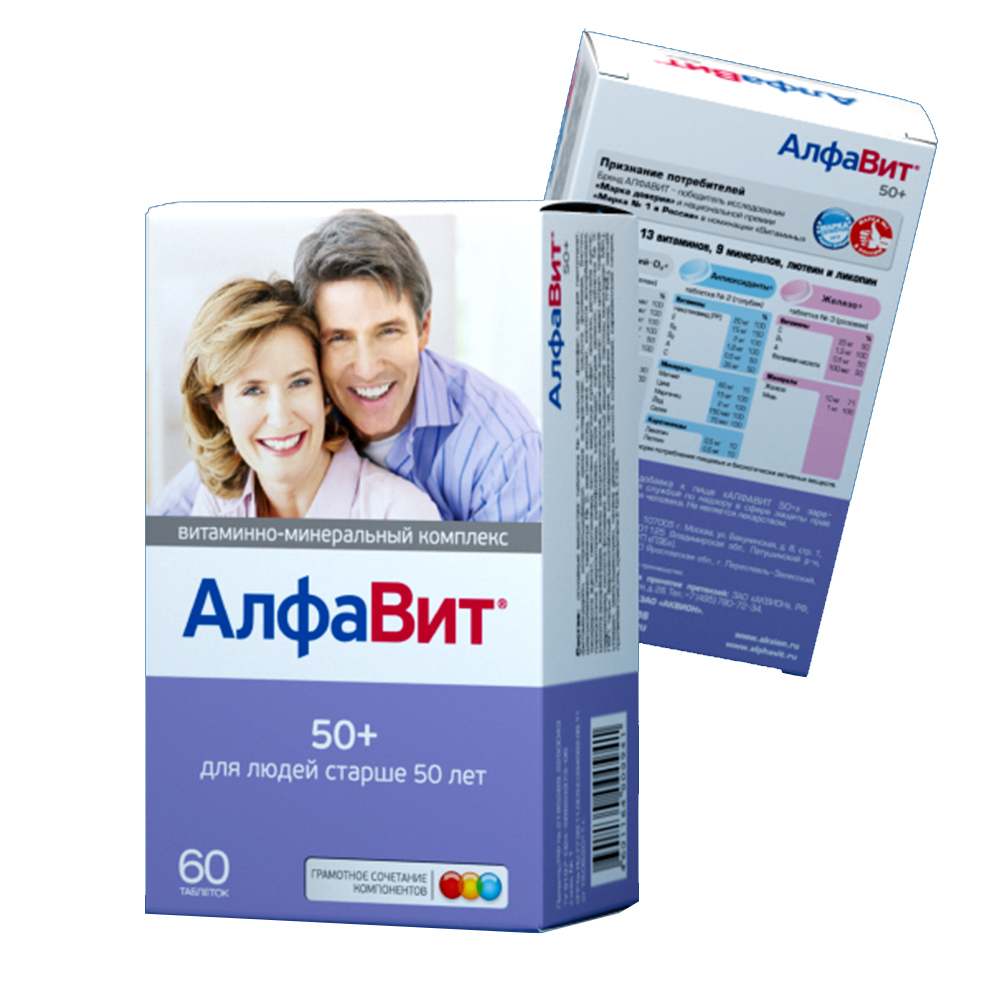 Алфавит 50+ рекомендуется в качестве дополнительного источника витаминов, макро- и микроэлементов для людей старше 50 лет и с целью профилактики остеопороза, заболеваний суставов, сердечно-сосудистой системы, зрения и других возрастных нарушений.