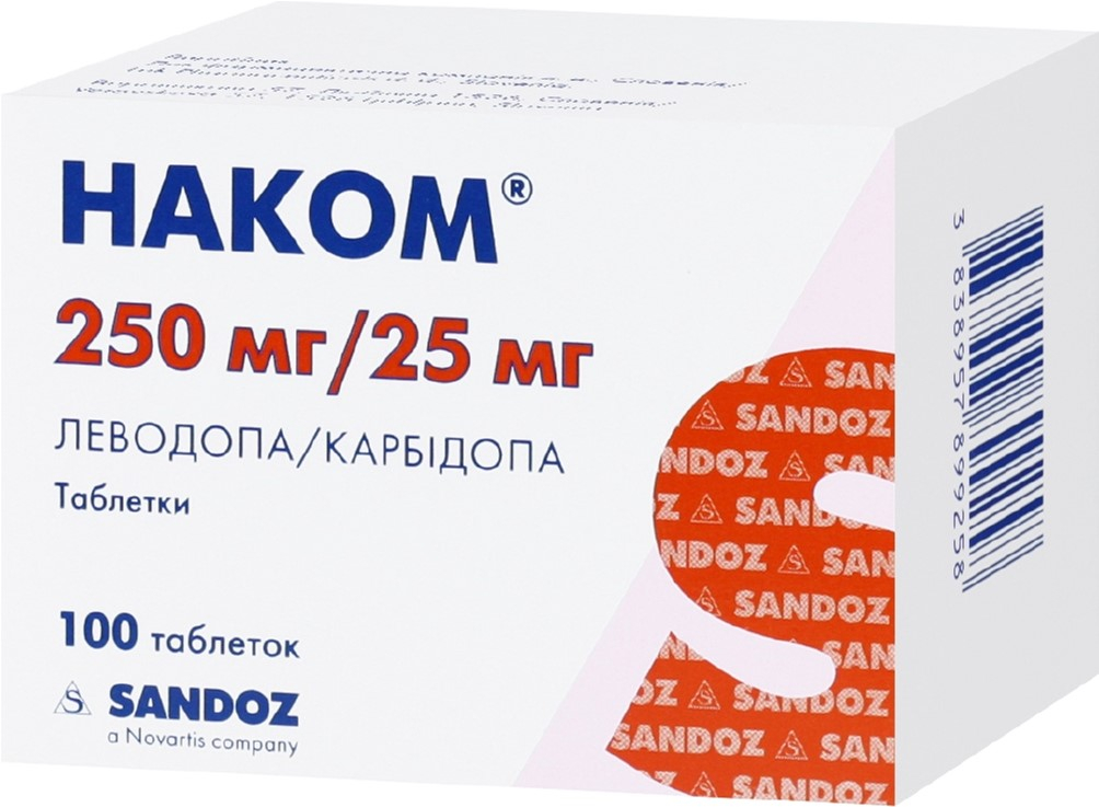 Противопаркинсоническое комбинированное средство - комбинация карбидопы (ингибитор декарбоксилазы ароматических 1-аминокислот) и леводопы (предшественник дофамина). Ослабляет и устраняет симптомы болезни Паркинсона и в том числе гипокинезию, ригидность, тремор, дисфагию, слюнотечение. Противопаркинсоническое действие леводопы обусловлено ее превращением в дофамин непосредственно в ЦНС, что приводит к восполнению дефицита дофамина в центральной нервной системе (ЦНС). Образовавшийся в периферических тканях дофамин не участвует в реализации противопаркинсонического эффекта леводопы (не проникает в ЦНС) и ответствен за большинство побочных эффектов леводопы. Карбидопа - ингибитор декарбоксилазы ароматических L-аминокиспот, снижает образование дофамина в периферических тканях, что косвенным образом приводит к повышению количества леводопы, поступающей в ЦНС. Наком® обеспечивает адекватное уменьшение симптомов болезни Паркинсона у большего числа пациентов. Действие препарата проявляется в течение первых суток с начала приема, иногда - после приема первой дозы. Максимальный эффект достигается в течение 7 дней.