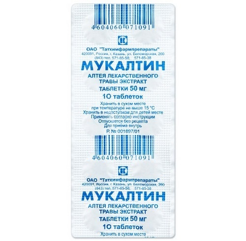 активное вещество: Алтея лекарственного травы экстракт (Мукалтина экстракт сухой) с содержанием полисахаридов в пересчете на глюкозу 18% - 50 мг;