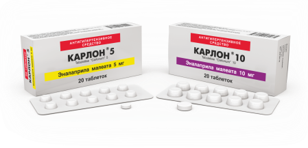 КАРЛОН является ингибитором АКФ продолжительного действия, который применяется для лечения артериальной гипертензии и хронической сердечной недостаточности. Активный метаболит эналаприла – эналаприлат, предотвращает превращение неактивного ангиотензина I в ангиотензин II и устраняет его сосудосуживающее действие. В результате происходит снижение концентрации плазменного и тканевого ангиотензина II. Вследствии ингибирования АКФ снижается артериальное давление, за счет вазодилатации артерий и вен. Он не оказывает существенного влияния на сердечный выброс и на ударный объем. Снижает общее периферическое сопротивление сосудов (ОПСС), уменьшает постнагрузку и преднагрузку, снижает давление в правом предсердии и малом круге кровообращения. Препарат уменьшает гипертрофию левого желудочка. При применении препарата снижается тонус выносящих артериол клубочков почек, тем самым улучшается внутриклубочковая гемодинамика, что препятствует развитию диабетической нефропатии.