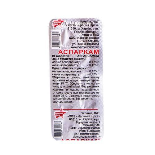 Действующее вещество: аспаркам, полуфабрикат-порошок - 490,0 мг, [аспарагиновая кислота (D,L-аспарагиновая кислота) - 253,92 мг, калия гидроксид (калия гидроокись) - 53,53 мг, магния оксид (магния окись) - 19,17 мг, вода очищенная - 25,83 мг, крахмал картофельный - 11,79 мг, крахмал кукурузный] - 125,76 мг, что соответствует: магния аспарагинат тетрагидрату - 175,0 мг, калия аспарагинат гемигидрату - 175,0 мг;
