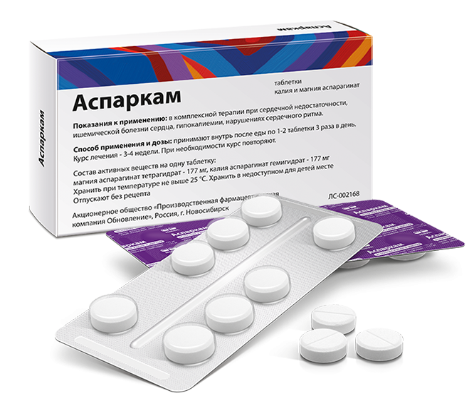 Аспаркам применяют в комплексной терапии при сердечной недостаточности, ишемической болезни сердца, гипокалиемии, нарушениях сердечного ритма (в т. ч. при инфаркте миокарда, передозировке сердечных гликозидов).