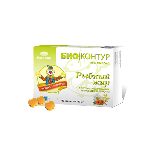 Жир рыбный пищевой с маслами ромашки, зверобоя и календулы - капсулы: 1 капсула содержит жир рыбный пищевой, масла ромашки, зверобоя и календулы; в упаковке 100 капсул по 0,3 г.
