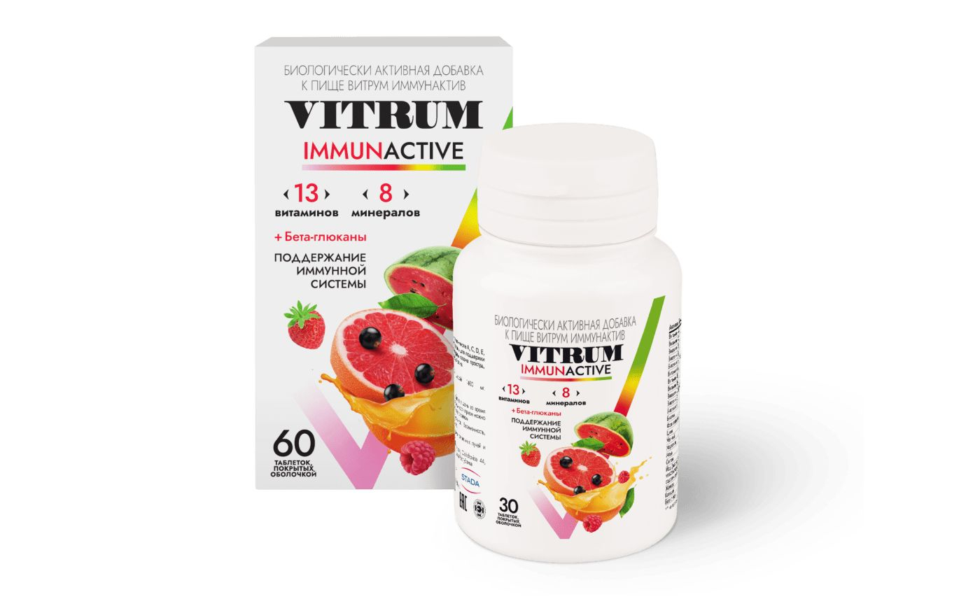 Витаминно-минеральный комплекс ВИТРУМ ИММУНАКТИВ VITRUM IMMUNACTIVE содержит 13 витаминов и 8 минералов, а также бета-глюканы и биофлаваноидный комплекс – необходимые компоненты, которые синергично работают для поддержки иммунитета: