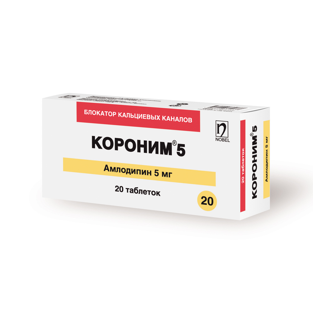 КОРОНИМ – является блокатором кальциевого канала продолжительного действия, который ингибирует трансмембранный перенос ионов кальция в гладкую мускулатуру сосудов и кардиомиоциты. Амлодипин избирательно блокирует перенос ионов кальция в клетки. Больше воздействует на гладкие мышцы сосудов, чем на кардиомиоциты, вследствие чего, не оказывает значимого влияния на сердечный выброс и на ударный объем. Амлодипин не оказывает влияния на уровень кальция в плазме крови. Как периферический вазодилататор, амлодипин влияет непосредственно на гладкие мышцы сосудов, вследствие чего уменьшается сопротивление периферических сосудов и снижается артериальное давление, вследствие чего потребность кардиомиоцитов в кислороде снижается. Антигипертензивный эффект сохраняется примерно 24 часа. Амлодипин не изменяет функцию синоатриального узла или атриовентрикулярную проводимость. Несмотря на примерно одинаковые изменения диастолического давления у молодых и пожилых пациентов, систолическое давление значительнее снижалось у пожилых.