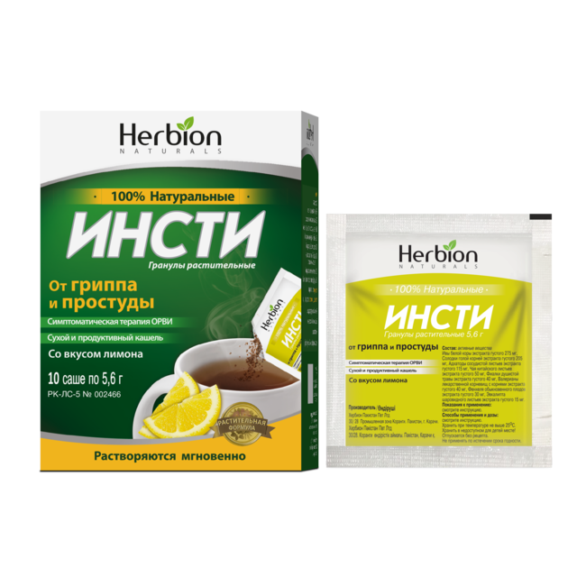 Инсти улучшает состояние пациентов, снижает повышенную температуры и интенсивность кашля. Способствует быстрому устранению симптомов ринита, фарингита, трахеита в течение 24 часов после его применения. Не вызывает сонливости и привыкания. Быстро растворим в горячей воде.