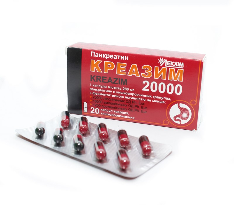 1 капсула Креазима 20000 содержит панкреатина в кишечнорастворимых гранулах с ферментативными активностями не менее: 20000 липолитических ЕД Ph. Eur., 16000 амилолитических ЕД Ph. Eur., 1200 протеолитических ЕД Ph. Eur.;