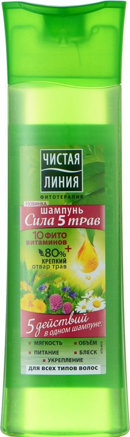 Для того, чтобы обеспечить волосам полноценный комплексный уход, зачастую приходится прибегать к использованию целого ряда средств. Именно поэтому эксперты Чистая Линия разработали специальный шампунь Сила 5 Трав, который объединил в себе полноценный уход за волосами в одном средстве. Крепкий отвар 5 целебных трав в составе шампуня, обогащенный фитовитаминами, действует в 5 направлениях: