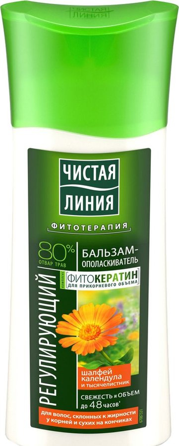 Бальзам-ополаскиватель “Регулирующий” для волос, склонных к жирности, контролирует активность сальных желез и надолго сохраняет ощущение свежести и чистоты, не пересушивая корни, а также питает и увлажняет волосы по всей длине. Бальзам создан на основе отвара целебных трав и содержит экстракты календулы, шалфея и тысячелистника. В календуле содержатся каротиноиды, флавоноиды (биологически активные вещества, обладающие антиоксидантными свойствами), кумарины и прочие полезные для кожи вещества. Благодаря им календула очищает, освежает, тонизирует. А ее минеральные вещества благоприятно воздействуют на сальные железы, помогая регулировать выделение кожного жира, сузить поры и бороться с проблемой возникновения прыщей. Именно поэтому календула считается отличным средством по уходу за жирной и проблемной кожей лица и волос.