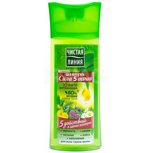 Для того, чтобы обеспечить волосам полноценный комплексный уход, зачастую приходится прибегать к использованию целого ряда средств. Именно поэтому эксперты Чистая Линия разработали специальный шампунь Сила 5 Трав, который объединил в себе полноценный уход за волосами в одном средстве. Крепкий отвар 5 целебных трав в составе шампуня, обогащенный фитовитаминами, действует в 5 направлениях: