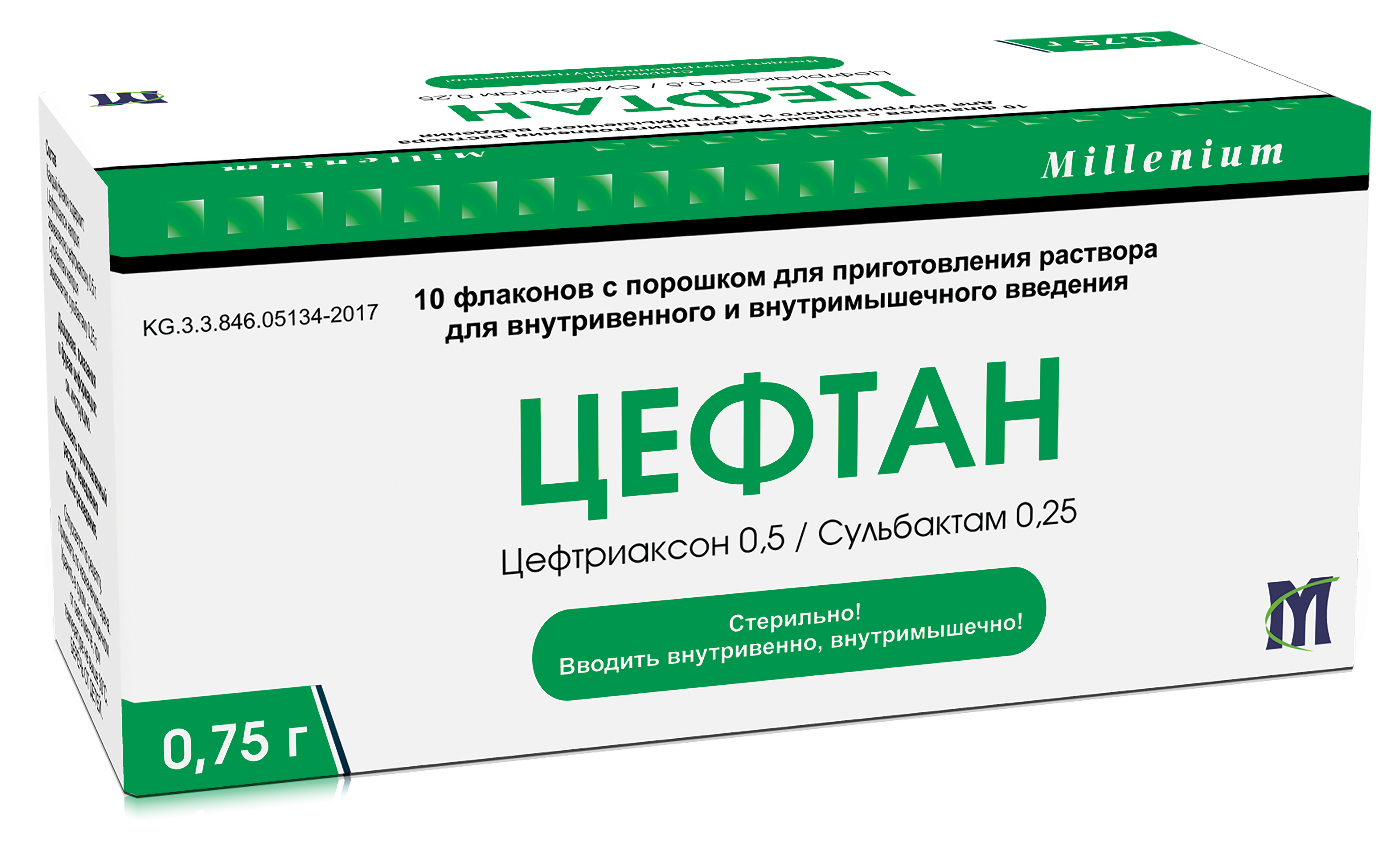 Цефтан является комбинацией цефтриаксона и сульбактама натрия. Цефтриаксон – полусинтетический антибиотик группы бета-лактамов, цефалоспорин III поколения; он оказывает бактерицидное действие, механизм которого связан с угнетением активности фермента транспептидазы, нарушением биосинтеза пептидогликана клеточной стенки микроорганизмов; обладает широким спектром действия. Активен в отношении грамположительных аэробов: Staphylococcus aureus (включая штаммы продуцирующие пенициллиназу), Staphylococcus epidermidis, Streptococcus pneumoniae, бета-гемолитических стрептококков группы А (S.pyogenes), стрептококков группы В (S.agalactiсae), группы Viridans, стрептококков неэнтерококковой группы D; грамотрицательных аэробов: E.coli, H. influenzae, H. parainfluenzae, Klebsiella spp. (включая K.pneumoniae), Morganella morganii, Neisseria gonorrhoeae (включая штаммы, продуцирующие пенициллиназу), Neisseria meningitidis, Proteus mirabilis, Proteus vulgaris, Providencia spp., Pseudomonas aeruginosa, Salmonella spp. (в т.ч. S.typhi), Serratia spp. (включая S.marcescens), Shigella spp., Yersinia spp. (в т.ч. Y.enterocolitica), Treponema pallidum; анаэробов: Bacteroides spp. (включая некоторые штаммы B.fragilis), Clostridium spp. (однако большинство штаммов C.difficile обладают резистентностью), Peptococcus spp., Peptostreptococcus spp., Fusobacterium spp.(за исключением F.mortiferum и F.varium). Препарат активен в отношении микроорганизмов, устойчивых к пенициллинам, цефалоспоринам первых поколений, аминогликозидам.
