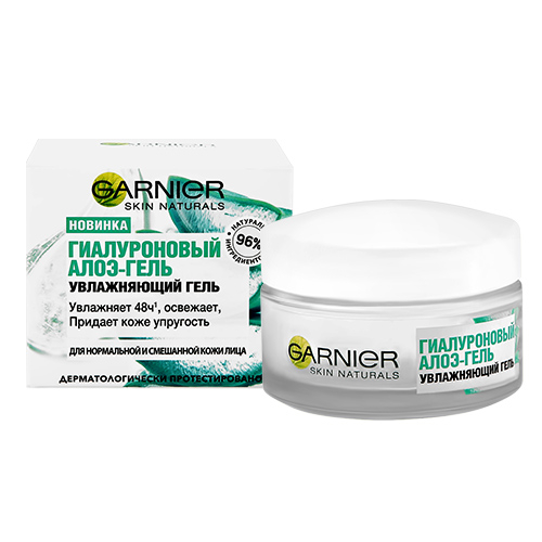 Гиалуроновый алоэ-гель от Garier - это увлажняющее средство с тающей гелевой текстурой для нормальной и смешанной кожи. Быстро впитывается, обеспечивает увлажнение до 48 часов, повышает упругость, придает коже свежий вид. Средство на 96% состоит из ингредиентов натурального происхождения. Остальные 4% обеспечивают стабильность формулы и приятную консистенцию. Экстракт алоэ вера увлажняет, тонизирует, снимает воспаление. Гиалуроновая кислота удерживает влагу внутри клеток кожи и повышает ее упругость. Средство прошло дерматологический контроль, применяется тремя разными способами: как дневной и ночной уходы, в качестве увлажняющей маски.