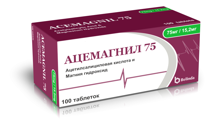 Профилактика повторного инфаркта миокарда и тромбоза кровеносных сосудов — 1 таблетка препарата Ацемагнил, содержащего АСК в дозе 75–150 мг, 1 раз в сутки.