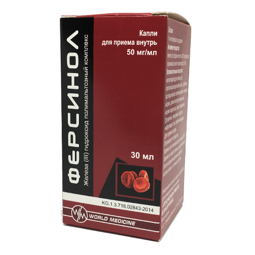 ФАРМАКОДИНАМИКА: Ферсинол - антианемический препарат, содержащий железо в форме полимальтозного комплекса железа (III) гидроксида. Данный макромолекулярный комплекс стабилен и не выделяет железо в виде свободных ионов в желудочно-кишечном тракте (ЖКТ), не обладает прооксидантными свойствами, что приводит к снижению окисления липопротеинов низкой плотности (ЛПНП) и липопротеинов очень низкой плотности (ЛПОНП). Комплекс сходен по структуре с естественным соединением железа - ферритином, благодаря чему железо (III) из кишечника поступает в кровь путем активного всасывания. Транспорт железа в плазме осуществляется с помощью γ-глобулина трансферрина, синтезирующегося в печени. Железо в комплексе с трансферрином переносится к клеткам организма, где оно используется для синтеза гемоглобина, миоглобина и железосодержащих ферментов. Трехвалентное железо участвует в образовании гема, что приводит к повышению уровня гемоглобина.