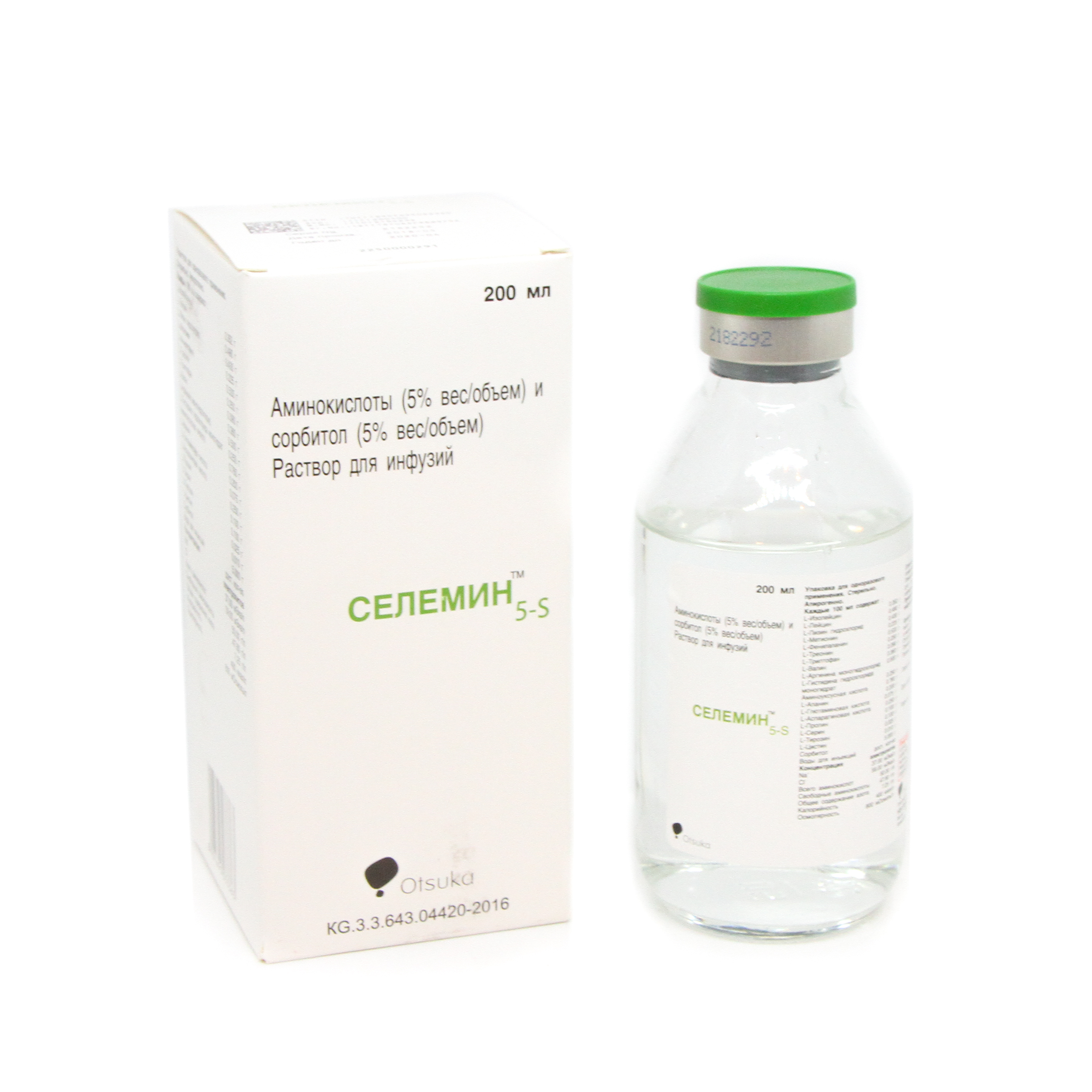 В 1 л раствора Селемин 5-S содержится аминокислот — 47.60 г, общего азота — 7.25 г, осмолярность — 800 мОсмоль. Общая энергетическая ценность препарата Селемин 5-S -400 ккал.