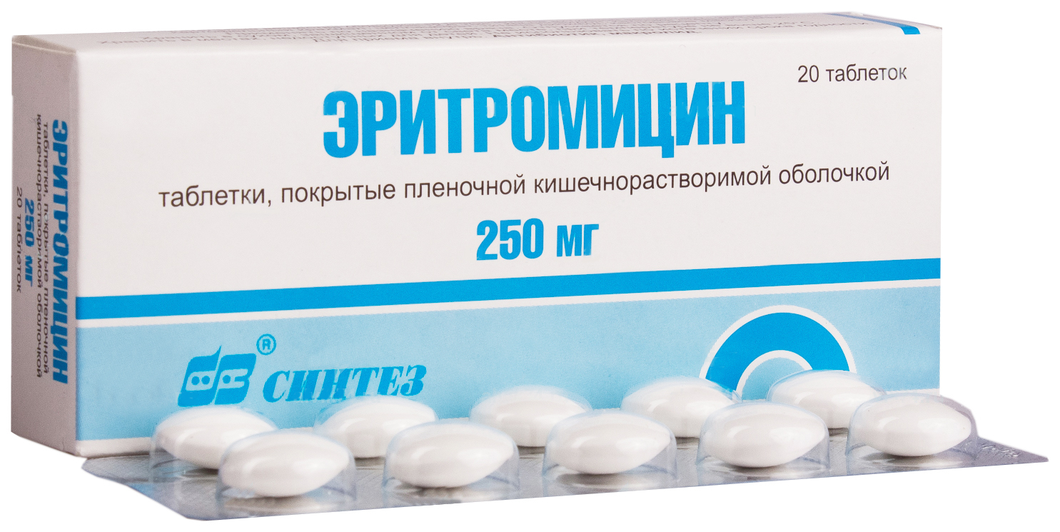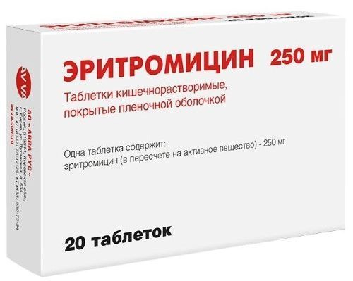 1 таблетка содержит эритромицина стеарат, эквивалентного 250 мг или 500 мг эритромицина;