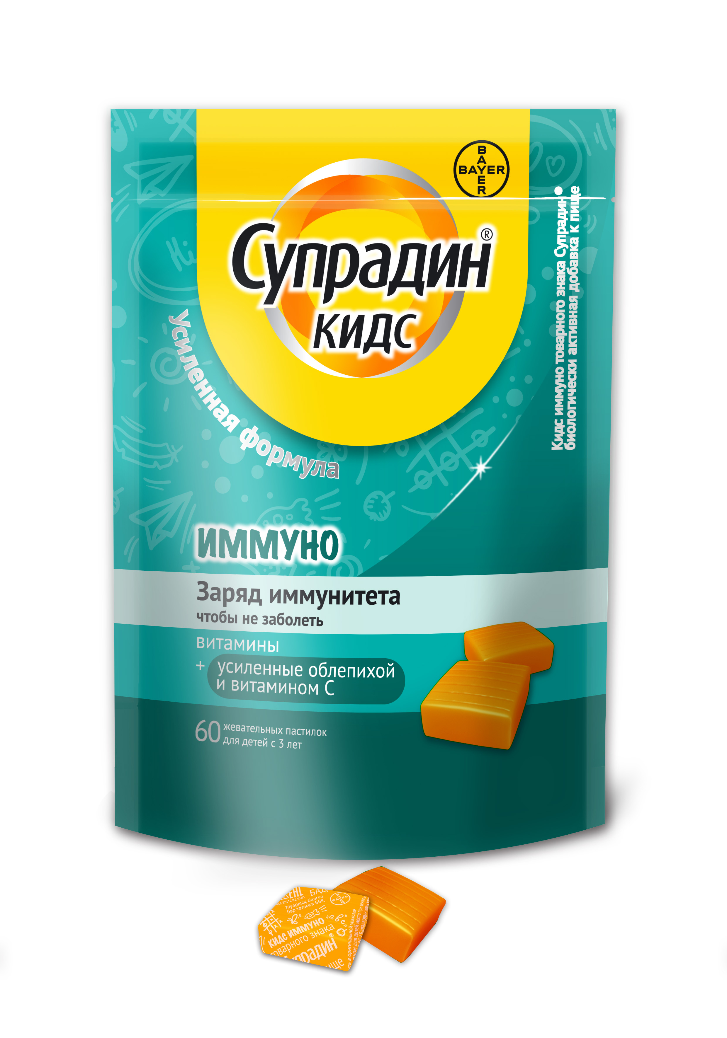Кидс иммуно товарного знака Супрадин биологически активная добавка к пище - комплекс витаминов, усиленный облепихой и витамином С, активирует иммунитет и позволяет не заболеть, поскольку снижает риск развития простудных заболеваний; восстанавливает силы организма в период выздоровления.