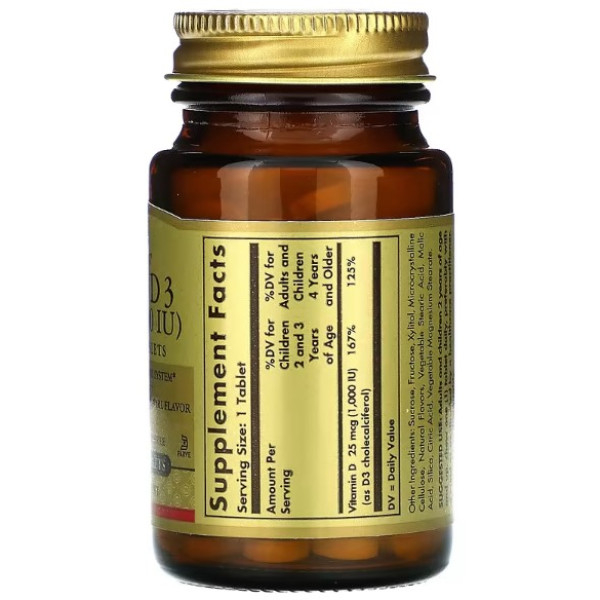 Solgar, витамин D3, натуральный клубнично-банановый вкус, 25 мкг (1000 МЕ), 100 жевательных таблеток