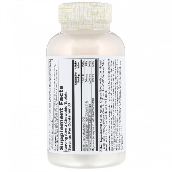 Solaray, Цитрат магния и кальция с витаминами D3 и K2, натуральный апельсиновый вкус, 90 жевательных таблеток