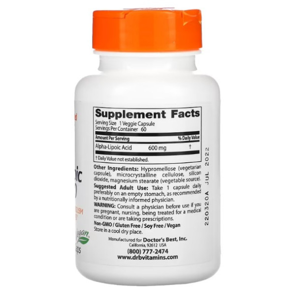 Doctor's Best, альфа-липоевая кислота, 600 мг, 60 вегетарианских капсул