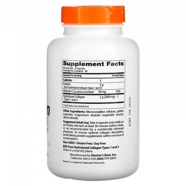 Doctor's Best, Peptan, коллаген 1 и 3 типов с витамином C, 500 мг, 240 капсул