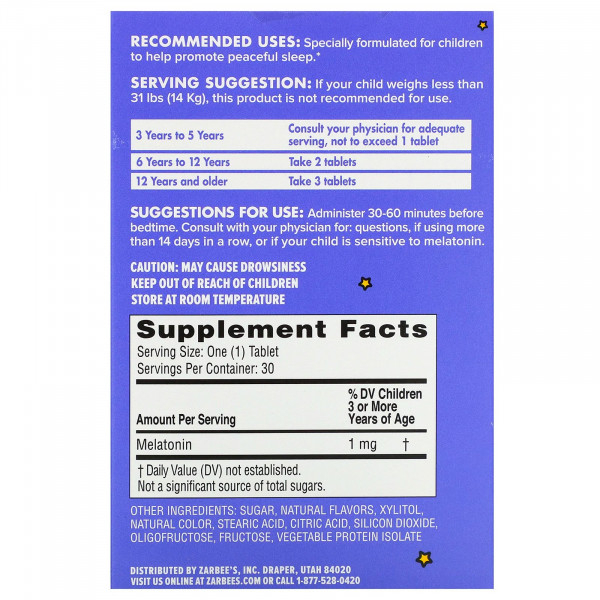 Zarbee's, Детское средство для сна с мелатонином, натуральный ароматизатор со вкусом винограда, для детей от 3 лет, 30 жевательных таблеток