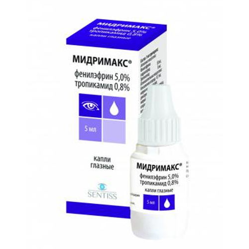 В 1 мл глазных капель Мидримакс содержится 50 мг фенилэфрина гидрохлорида и 8 мг тропикамида.