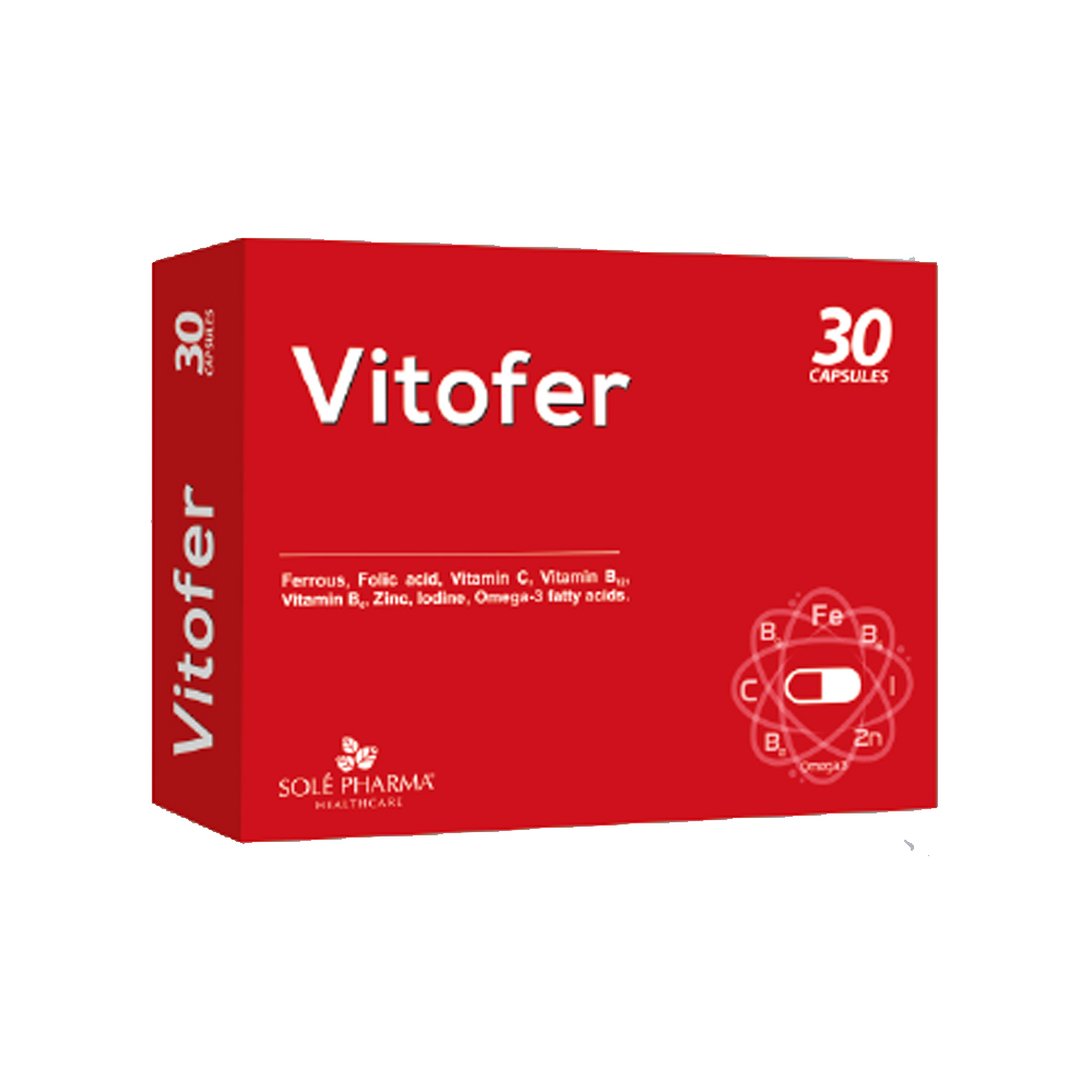 Vitofer- это витаминно-минеральный комплекс для беременных, который сочетает в себе самые необходимые и важные ингредиенты, которые необходимы для обеспечения здоровой беременности. Дополнительное потребление фолиевой кислоты повышает статус фолиевой кислоты у матери. Низкий уровень фолиевой кислоты у матери является фактором риска развития дефектов нервной трубки у развивающегося плода. Цинк способствует нормальной плодовитости и размножению. Цинк, железо и витамин B12 участвуют в процессе деления клеток. Йод способствует нормальному производству гормонов щитовидной железы и нормальной функции щитовидной железы. Витамин В6 способствует регуляции гормональной активности. Железо способствует нормальному образованию эритроцитов и гемоглобина и нормальному транспорту кислорода в организме. Витамин С увеличивает усвоение железа. Продукт предназначен для женщин детородного возраста.