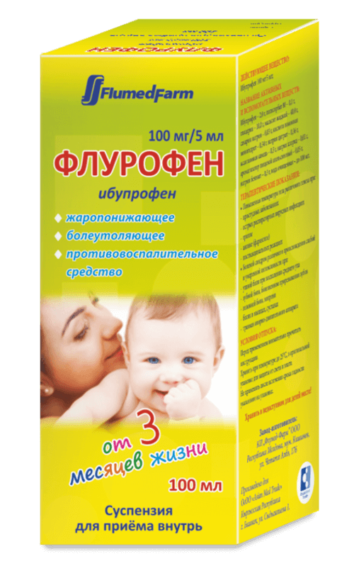Перед применением взболтать содержимое флакона. Боль или повышенная температура тела Рекомендуемая суточная доза ФЛУРОФЕН 100 мг/5мл равна 20-30 мг ибупрофена/кг, назначенная в разделённых дозах. В зависимости от возраста ребёнка, применяя крышечку или шприц дозатор, назначаются следующие дозы: 3-12 месяцев: 50 мг ибупрофена (2,5 мл суспензии), 3 раза в день. 1-3 года: 100 мг ибупрофена (5 мл суспензии), 3 раза в день. 4-6 лет: 150 мг ибупрофена (7,5 мл суспензии), 3 раза в день. 7-9 лет: 200 мг ибупрофена (10 мл суспензии), 3 раза в день. 10-12 лет: 250 мг ибупрофена (15 мл суспензии), 3 раза в день. При лихорадочном синдроме после иммунизации: назначается доза 50 мг ибупрофена следуемая, при необходимости, повторной дозой 2,5 мл суспензии, при 6 часовом интервале. Не следует применять более 5 мл суспензии при 24 часовом интервале. Если, после 3 дней, жар не спадает, рекомендуется консультация врача. Пациенты группы риска Почечная недостаточность: нет необходимости в снижении дозы у пациентов с лёгкой или умеренной почечной недостаточностью. Печёночная недостаточность: нет необходимости в снижении дозы у пациентов с лёгкой или умеренной печёночной недостаточностью.