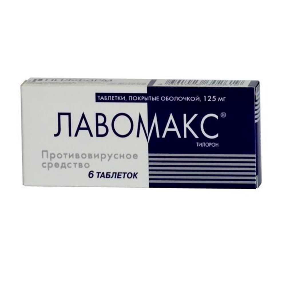 После приёма внутрь тилорон быстро всасывается из желудочно-кишечного тракта. Биодоступность составляет 60 %. Около 80 % тилорона связывается с белками плазмы крови. Выводится тилорон практически в неизменённом виде с калом (70 %) и мочой (9 %). Период полувыведения (Т1/2) составляет 48 часов. Тилорон не подвергается биотрансформации и не накапливается в организме. Фармакодинамика Лавомакс® стимулирует образование в организме α, β и γ-интерферонов. Основными продуцентами интерферона в ответ на введение тилорона являются клетки эпителия кишечника, гепатоциты, Т-лимфоциты и нейтрофилы. После приёма внутрь максимум продукции интерферона определяется в последовательности – кишечник-печень-кровь через 4-24 часа. Тилорон обладает иммуномодулирующим и противовирусным эффектом. Стимулирует стволовые клетки костного мозга, усиливает антителообразование, уменьшает степень иммунодепрессии, восстанавливает соотношение Т-хелперы/Т-супрессоры. Эффективен против различных вирусных инфекций, в том числе против вирусов гриппа, других острых респираторных инфекций, вирусов гепатитов, герпесвирусов, цитомегаловирусов и нейротропных вирусов. Механизм антивирусного действия связан с ингибированием трансляции вирус-специфических белков в инфицированных клетках, в результате чего подавляется репродукция вирусов.
