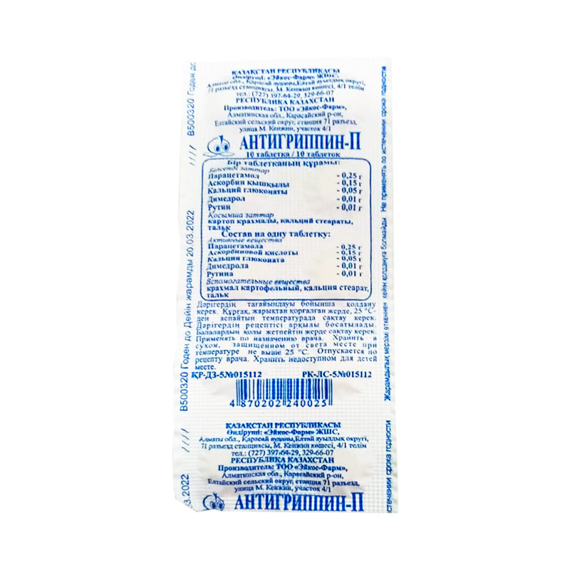 Одна таблетка содержит активные вещества: парацетамол – 0,25 г, кислота аскорбиновая – 0,15 г, кальция глюконат – 0,05 г, димедрол – 0,01 г, рутин – 0,01 г, вспомогательные вещества: крахмал, тальк, кальция стеарат.