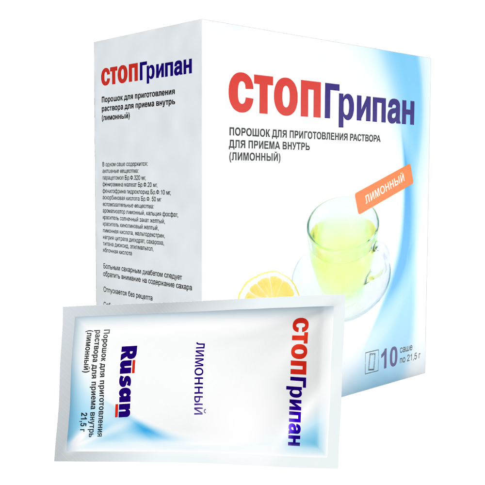 Стопгрипан Лимон – это комбинация эффективных и безопасных лекарственных средств, действующих на основные звенья в патогенезе простудных заболеваний. Парацетамол обладает жаропонижающим и обезболивающим действием; кислота аскорбиновая компенсирует потребности организма в витамине С, растут при простудных заболеваниях; фенирамину малеат – блокатор Н1-гистаминовых рецепторов, обеспечивает десенсибилизирующее действие, что проявляется уменьшением воспалительной реакции слизистых оболочек верхних дыхательных путей (улучшается носовое дыхание, уменьшается насморк, проходят чихание и слезотечение); фенилэфрин гидрохлорид обусловливает уменьшение отека и гиперемии слизистой оболочки верхних дыхательных путей и синусов.