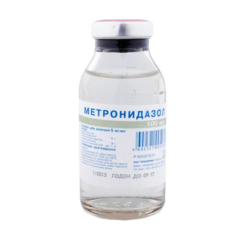 100 мл раствора содержат, активное вещество – метронидазол 0,5г,