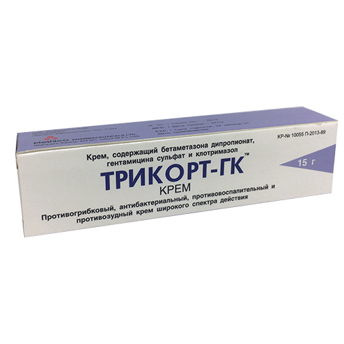 Комбинированный препарат Трикорт GC сочетает в себе противоспалительное,противозудное, противоаллергическое и антиэкссудативное действие бетаметазона спротивогрибковой активностью клотримазола и широким антибактериальным действиемгентамицина.