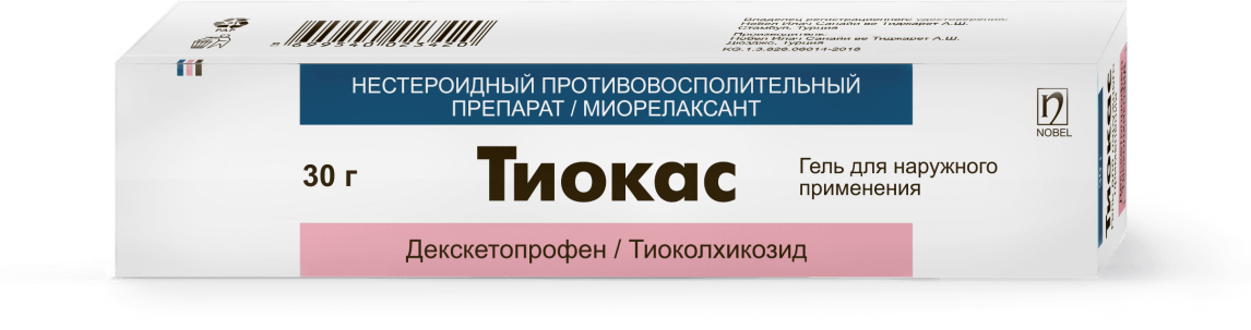 Преимущество препарата ТИОКАС заключается в том, что он легко проникает через кожу и беспрепятственно действует на скелетные мышцы. Гель при местном применении уменьшает боль и отек в обработанной области. Таким образом обеспечивает облегчение обостренной боли скелетных мышц без характерных побочных действий, отмечаемых при приеме внутрь нестероидных противовоспалительных средств. Отличается очень хорошей переносимостью в месте применения, даже при чувствительной коже.
