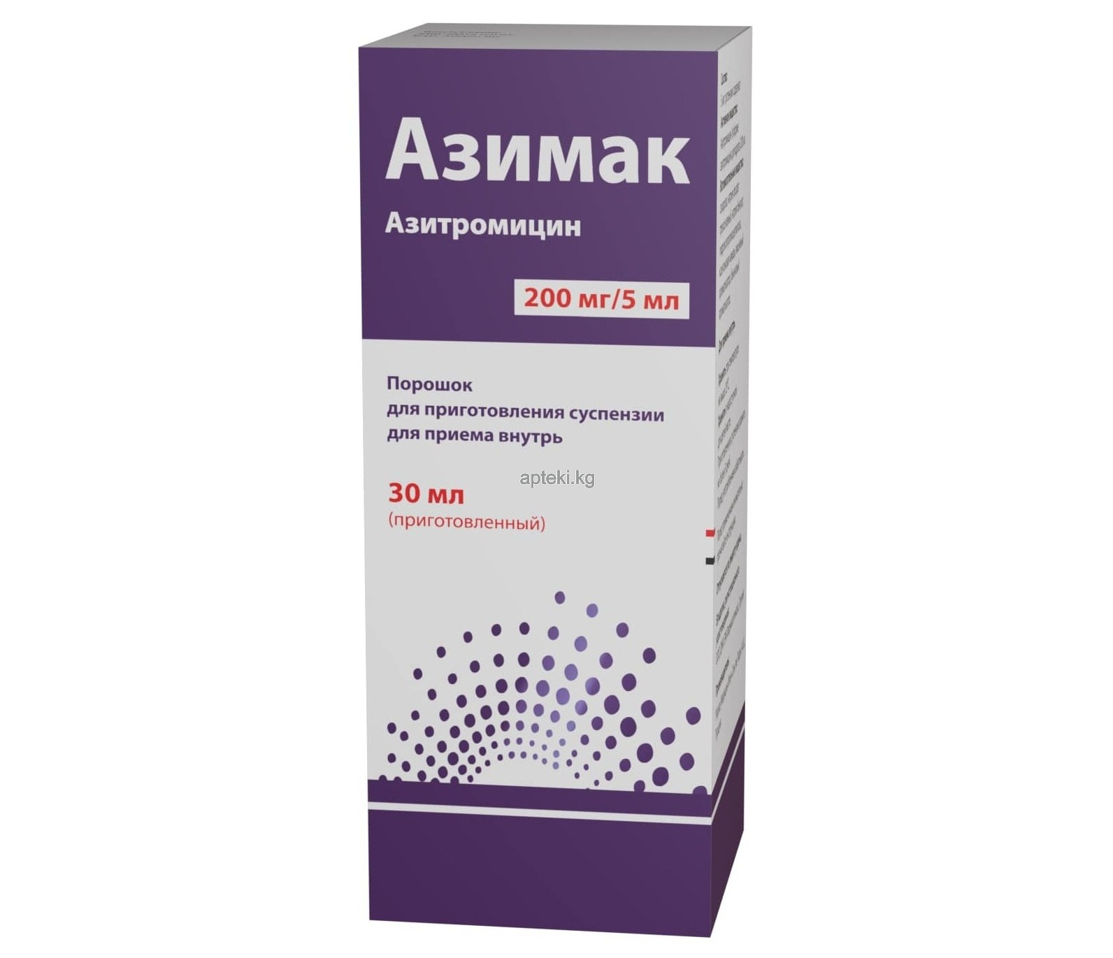 АЗИМАК 200 мг/5 мл, порошок для приготовления суспензии для приема внутрь, содержится в полиэтиленовом флаконе объемом 60 мл с полипропиленовой крышкой, снабженной индукционной фольгой белого цвета. 1 флакон вместе с 1 мерным шприцем (5 мл), 1 пластиковой двухсторонней мерной ложкой (2.5 – 5 мл), 1 полипропиленовым мерным стаканчиком и листком-вкладышем в картонной коробке.