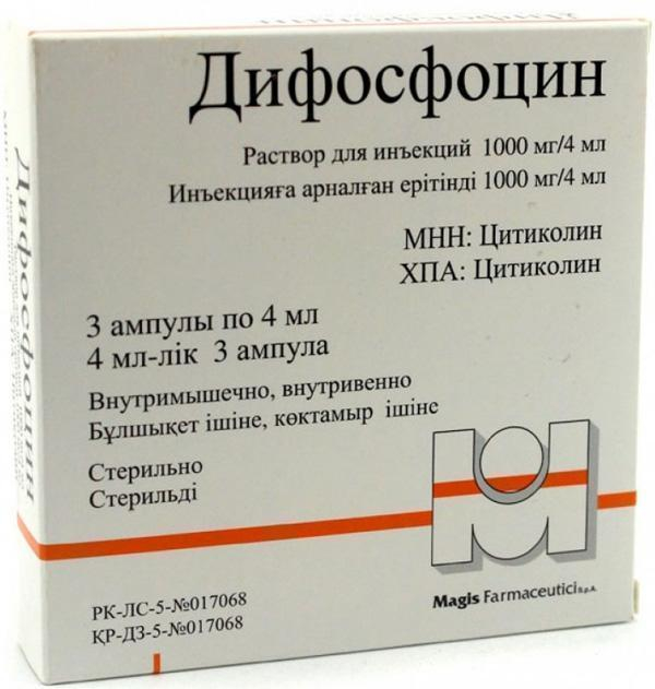 Средство улучшающее мозговой метаболизм. Активное вещество Дифосфоцина – цитиколин, являясь источником холина, стимулирует синтез структурных фосфолипидов мембран нейронов, что способствует улучшению функции мембран, в том числе, функционированию ионообменных насосов и нейрорецепторов. Благодаря стабилизирующему действию на мембрану, цитиколин обладает противоотечными свойствами и уменьшает отек мозга. Цитиколин ослабляет выраженность симптомов церебральной дисфункции после патологических процессов, как черепно-мозговая травма или острые нарушения мозгового кровообращения. В остром периоде инсульта уменьшает объем поврежденной ткани, улучшает холинергическую передачу. Улучшает церебральный кровоток, активирует структуры ретикулярной формации головного мозга, восстанавливает сознание. Цитиколин снижает уровень амнезии, улучшает состояние при когнитивных, сенситивных и двигательных расстройствах, также ослабляет выраженность симптомов, которые наблюдаются при гипоксии и ишемии мозга, включая ухудшение памяти, эмоциональную лабильность, нарушение способности выполнять обычные действия по самообслуживанию.